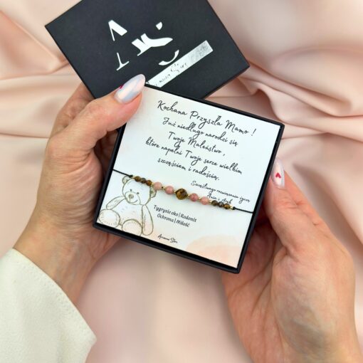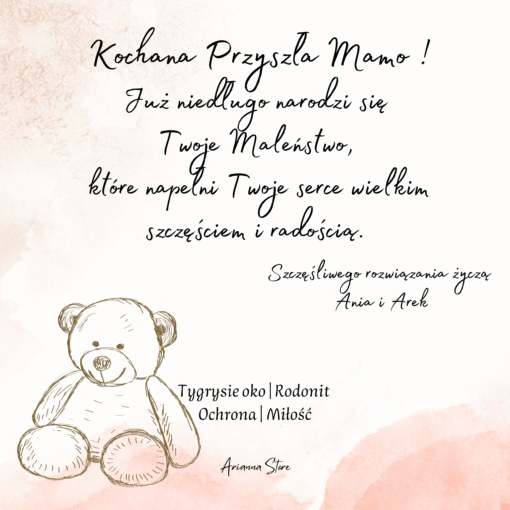 - Tygrysie oko – symbol siły i odwagi, dodaje pewności siebie oraz chroni przed stresem i negatywną energią. To kamień, który pomoże przyszłej mamie zachować równowagę i wewnętrzny spokój w nowym etapie życia.