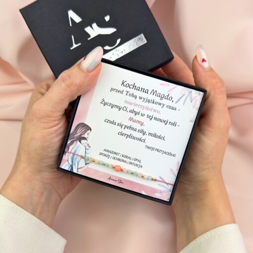 - Amazonit – kamień harmonii i spokoju. Pomaga wyciszyć emocje, dodaje siły w chwilach zmęczenia i wspiera wewnętrzną równowagę. Idealny dla przyszłej mamy, która potrzebuje ukojenia i pozytywnej energii.
