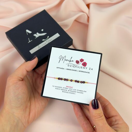 Bransoletka z granatem który uznawany jest również za kamień ochronny, który chroni przed negatywną energią i wspiera w trudnych momentach zmian. Idealnie komponuje się z symboliką nowego etapu w życiu zawodowym.