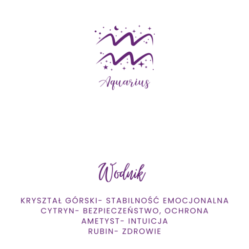 - Kryształ Górski – wzmocnienie energii i jasność myśli, wspiera Wodników w osiąganiu równowagi i duchowego wzrostu.