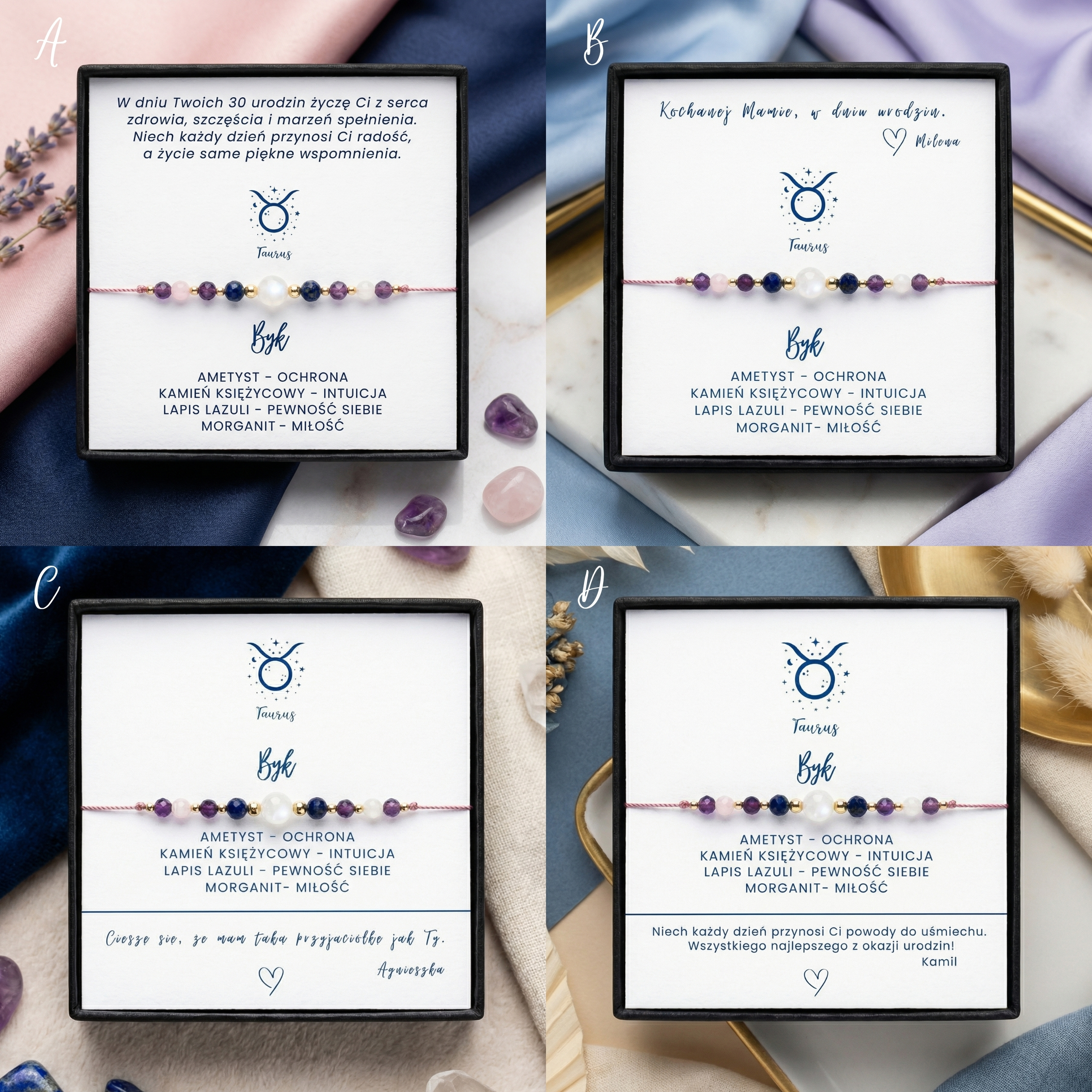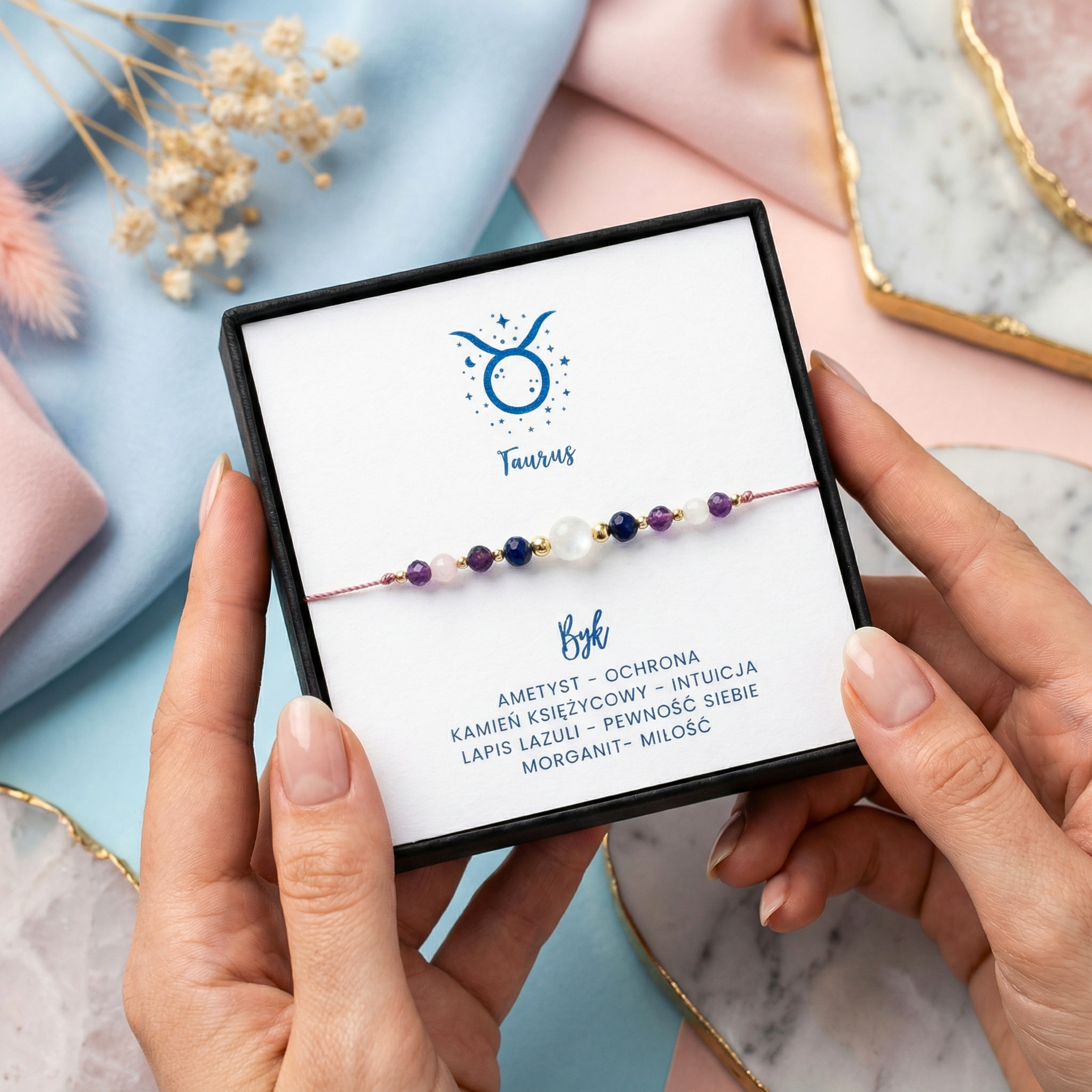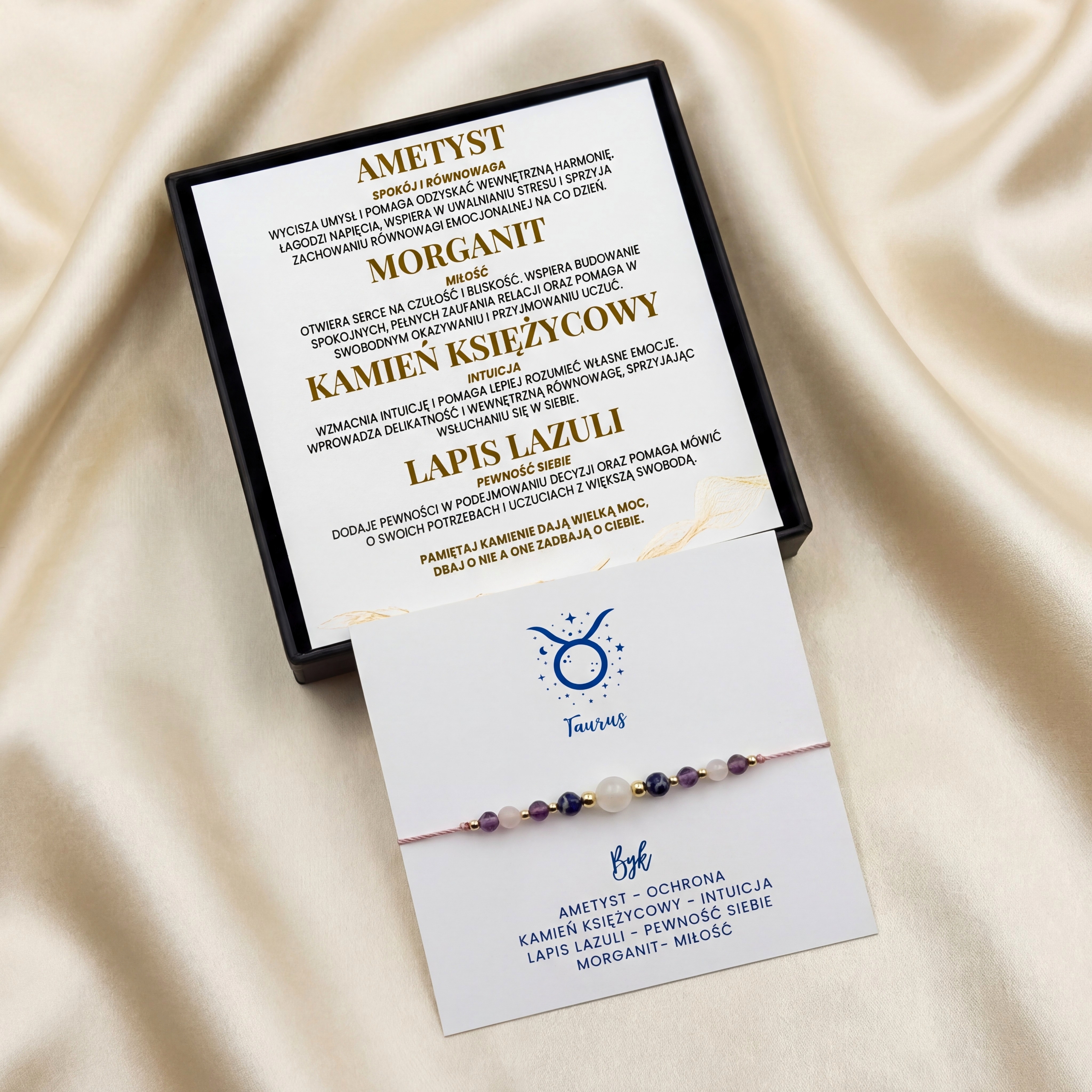 Bransoletka Zodiakalna: Byk – Ametyst, Kamień Księżycowy, Lapis Lazuli, Morganit