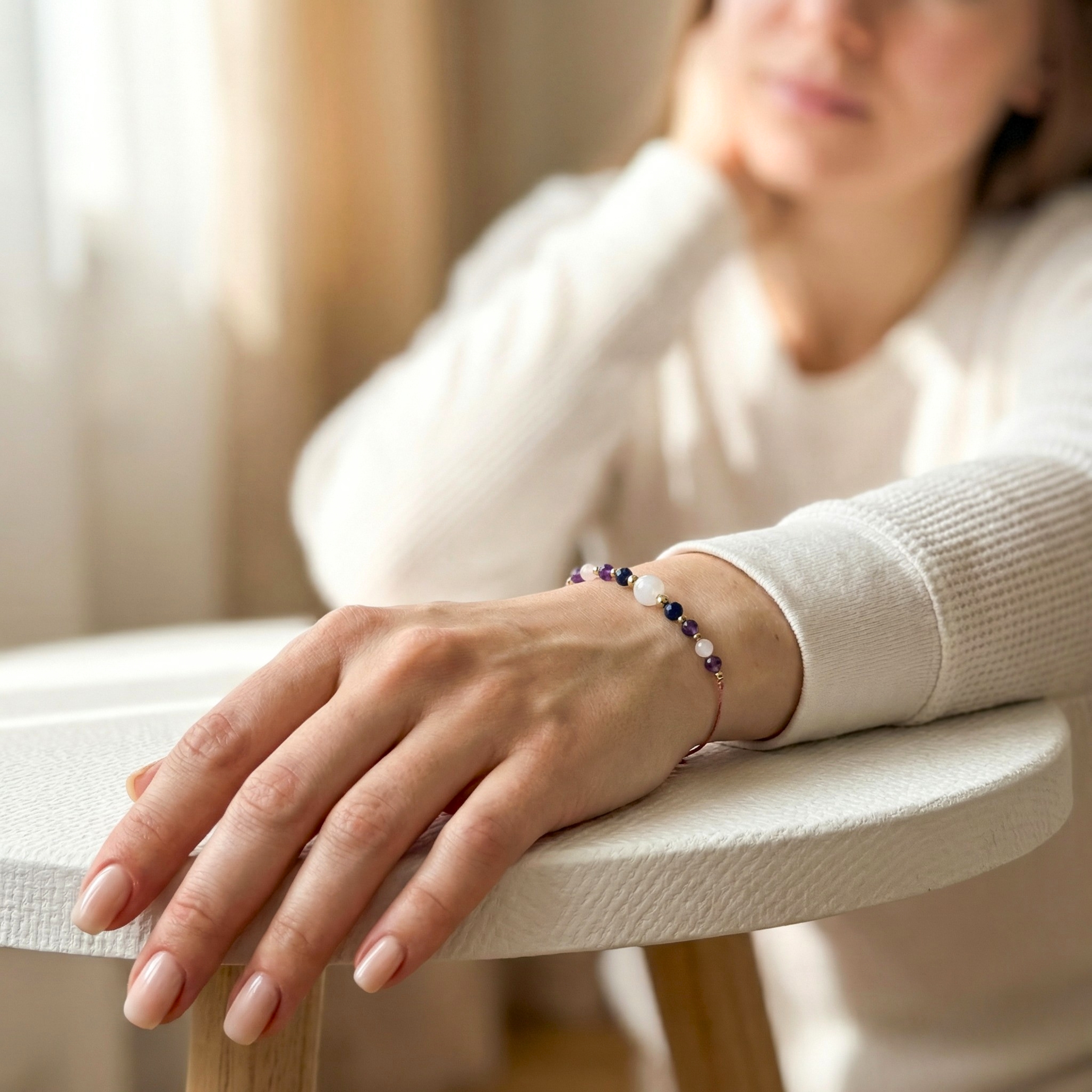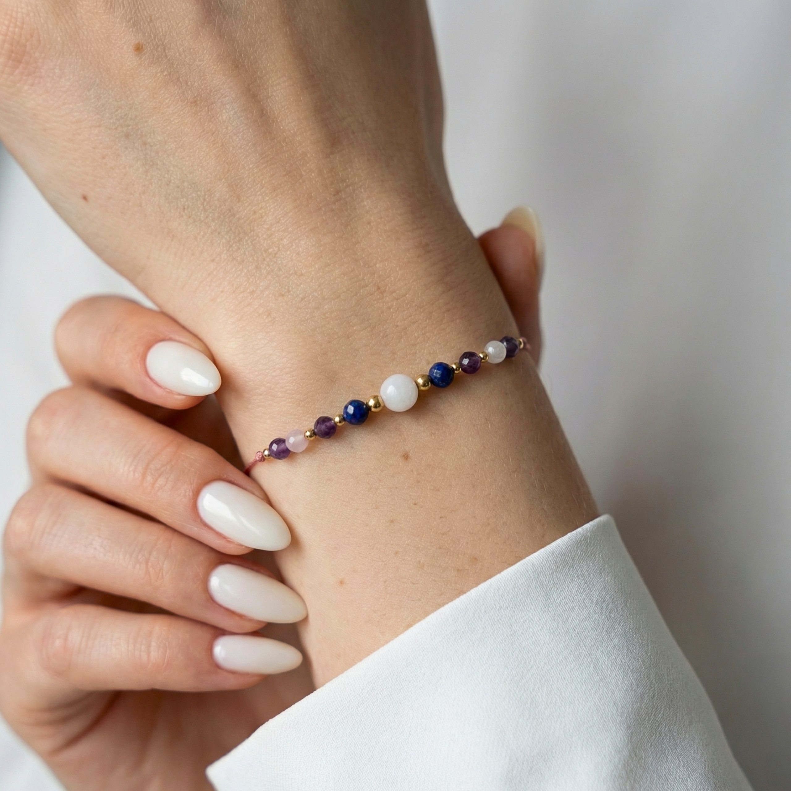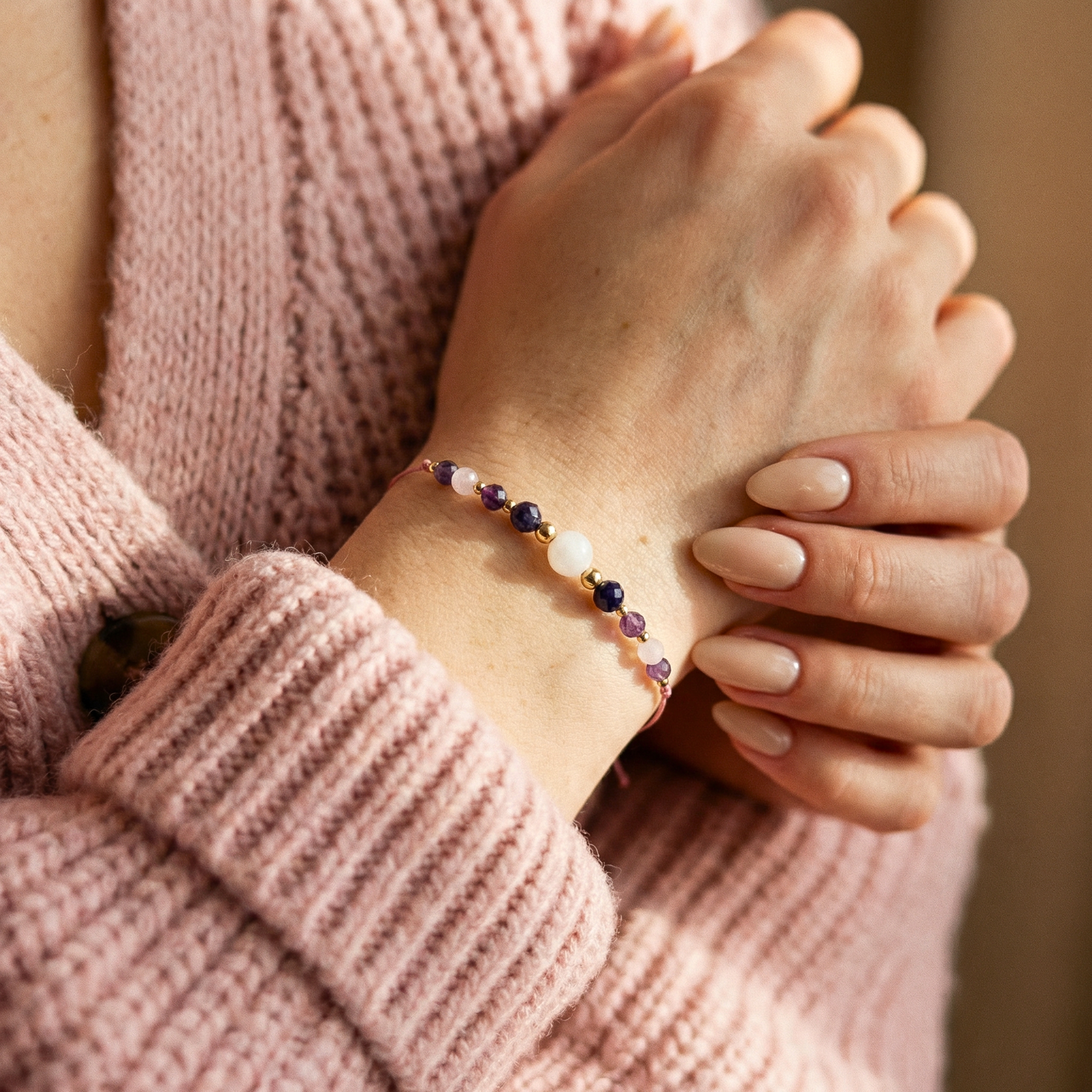 Bransoletka Zodiakalna: Byk – Ametyst, Kamień Księżycowy, Lapis Lazuli, Morganit