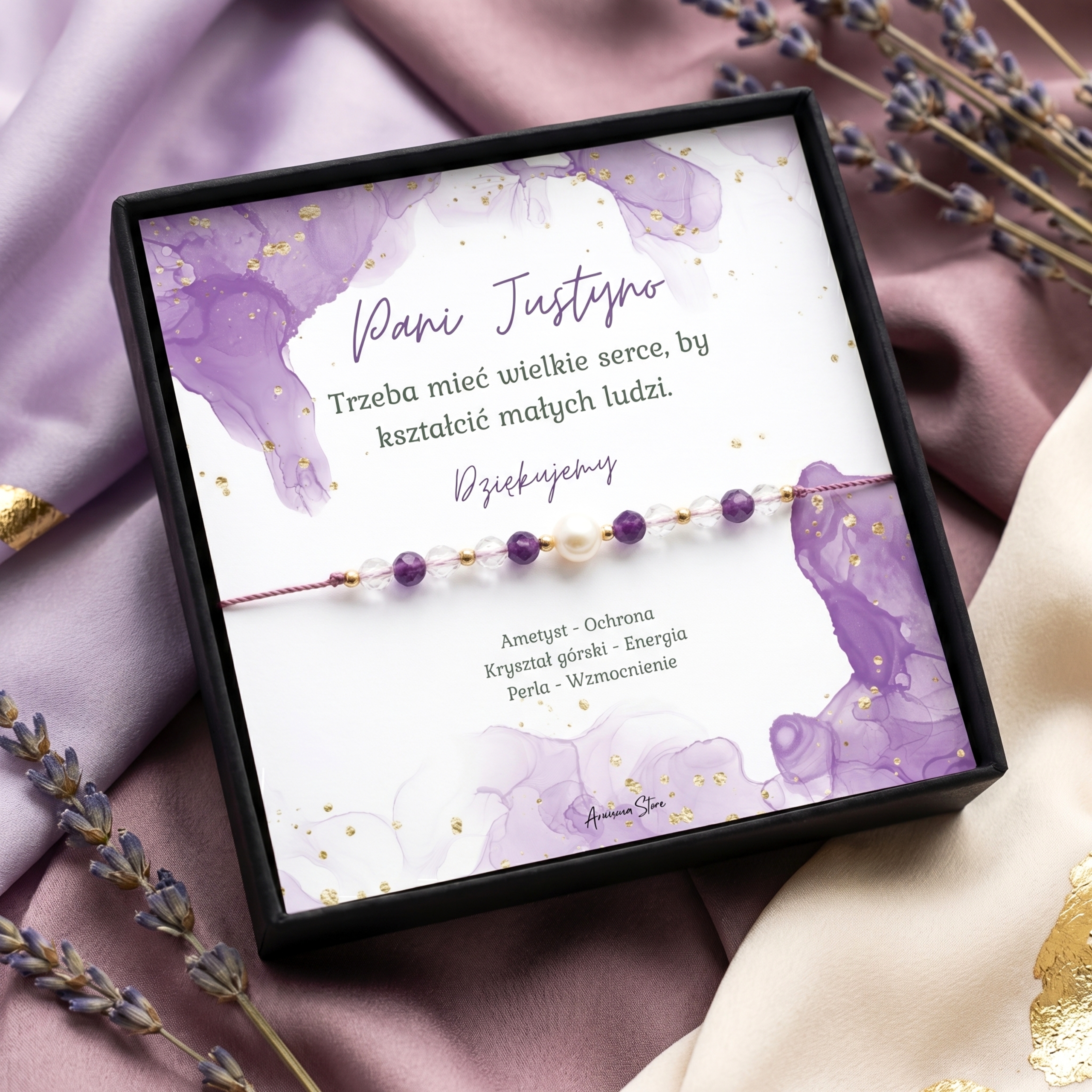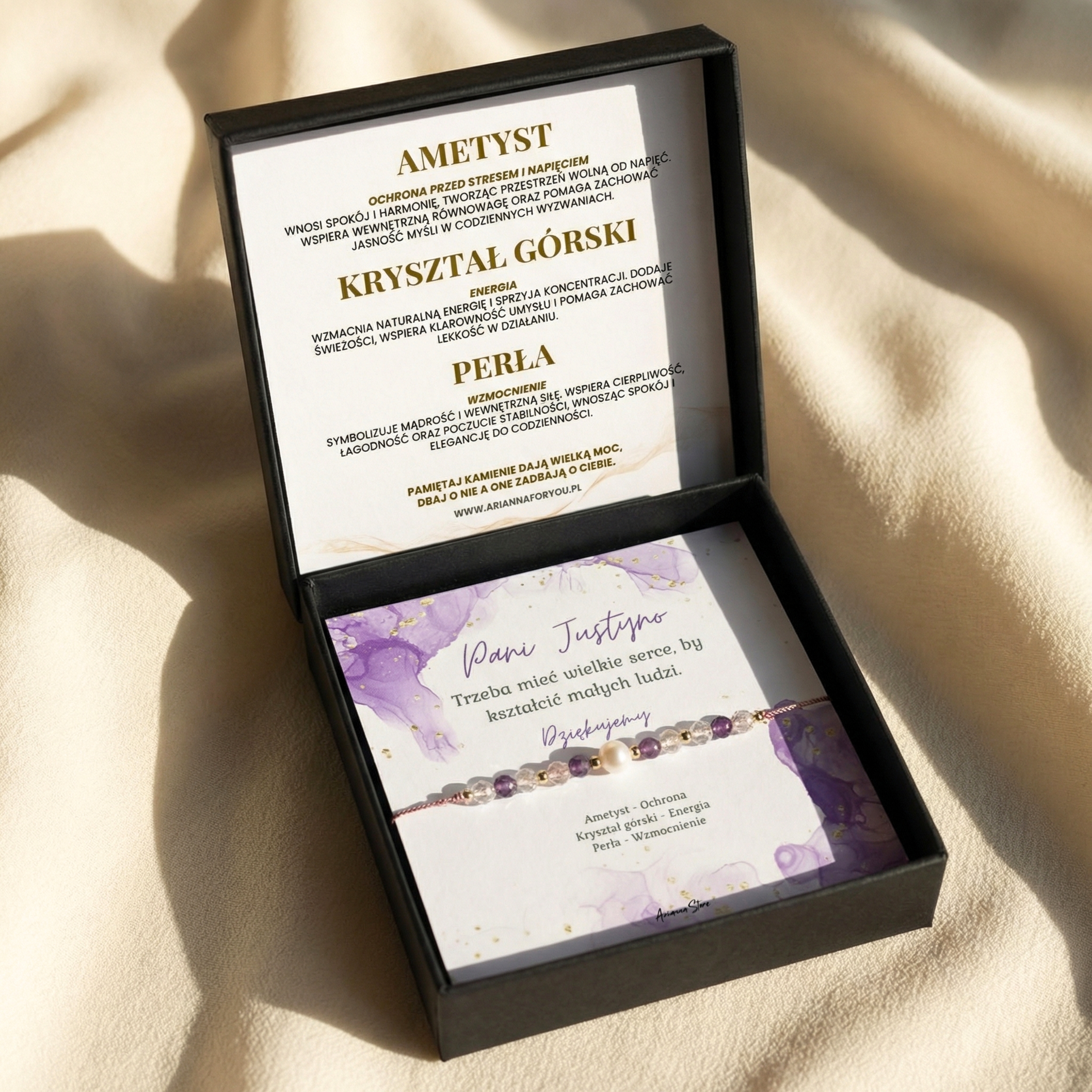 Eleganckie pudełko biżuteryjne + opis kamieni użytych w bransoletce w środku.