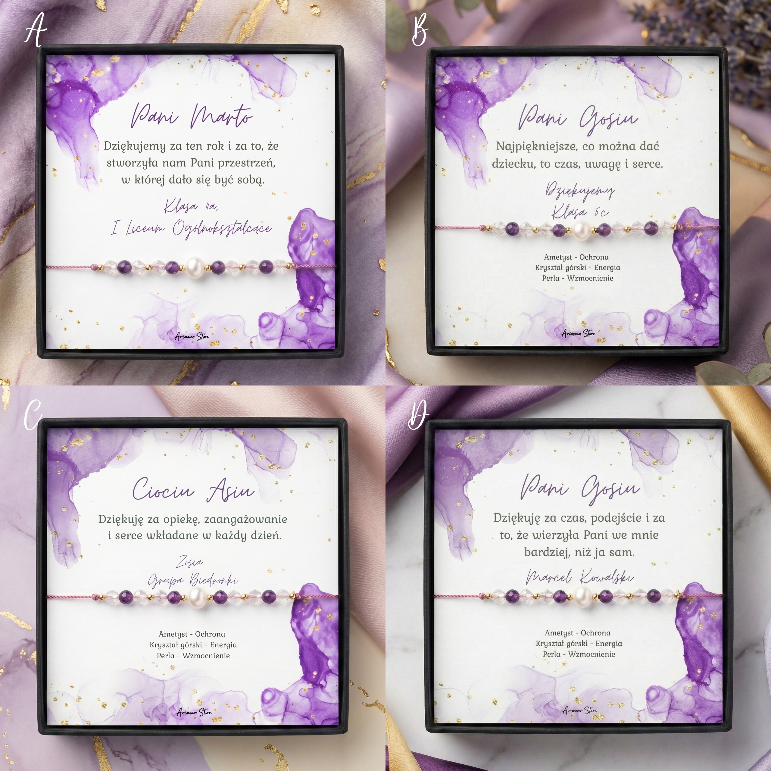 Ametyst: kamień spokoju i mądrości, pomaga w skupieniu i przynosi harmonię.